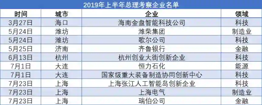 据统计,今年上半年,总理李克强至少在6个城市考察了10个企业。这10个企业里头,5个是高科技企业,2个是金融企业,2个是制造企业,还有1个是能源企业。