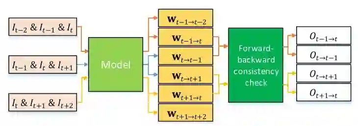 图3 多帧自训练的数据流。为了估计三帧流学习的遮挡图,我们使用五个图像作为输入。这样,我们可以进行前后一致性检查,以分别估计I t和I t + 1之间,I t和I t-1之间的遮挡图。