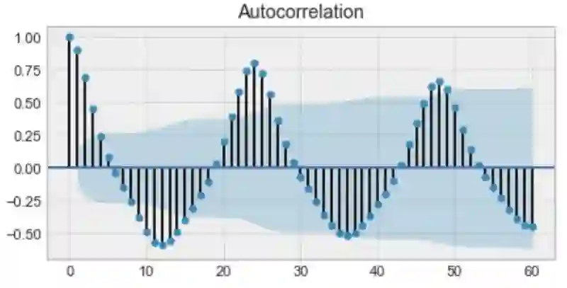 以上是自相关图的示例。仔细观察,你会发现第一个值和第24个值具有很高的自相关性。同样,第12和第36次观察是高度相关的。这意味着我们会在每24个单位时间内找到一个非常相似的值。