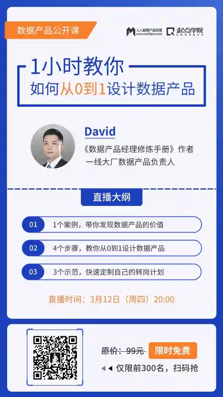 3月12日(本周四)晚20:00,人人都是产品经理社区、起点学院特邀《数据产品经理修炼手册:从零基础到大数据产品实践》作者、上市公司大数据产品项目负责人@David老师做客分享。