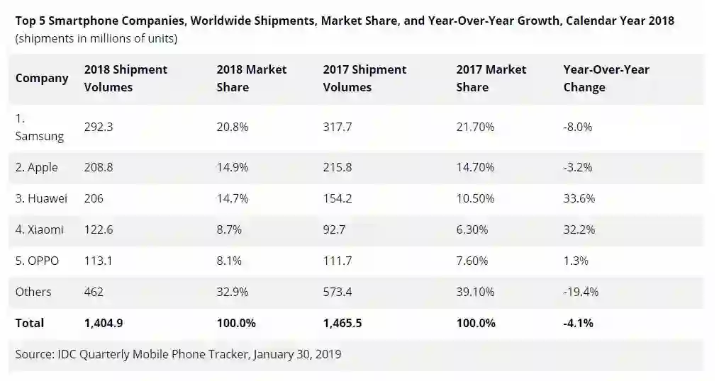 根据 IDC 公布的数据,2018 年,苹果智能手机出货量超过了 2 亿台,全球排名第二,仅次于三星。考虑到苹果只做高端产品,这个体量是相当惊人的,苹果通过 iPhone 攫取了手机市场上的绝大部分利润。