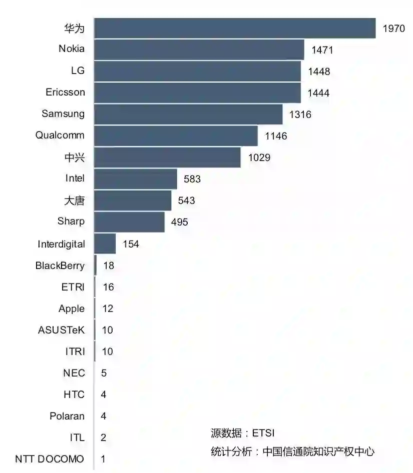 和苹果的 5G 困境相比,华为在 5G 时代则可以说是如鱼得水。就目前而言,能同时做到5G 标准+5G 基站+5G 基带+5G 终端的只有华为一家。在信通院发布的 5G 声明专利量统计名单中,华为的专利数量有近 2000 项,排名第一。