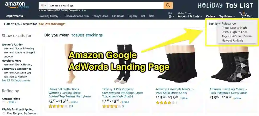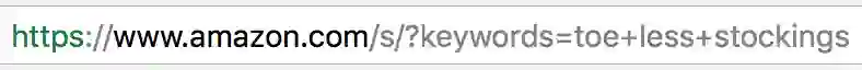 下图就是网址最后呈现的样子, 如果你在 Google 搜索「露趾丝袜」,然后点击亚马逊在 Google 投放的广告,就会看到——亚马逊动态把搜索词追加到了 URL 末端: