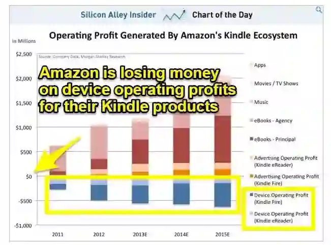 而最令人感兴趣的是,亚马逊是在亏损的情况下销售 Kindle,之后再从数字化内容中获利。