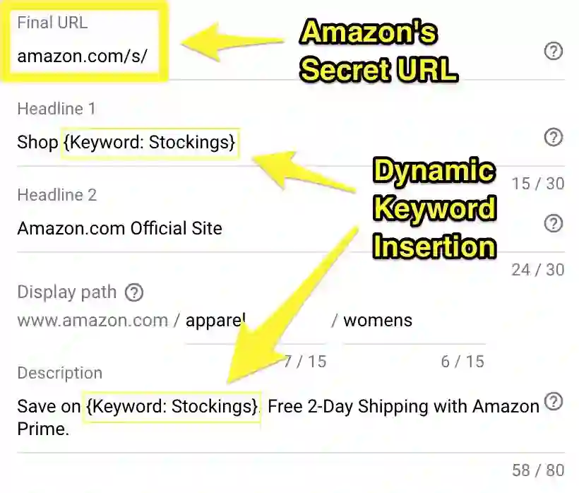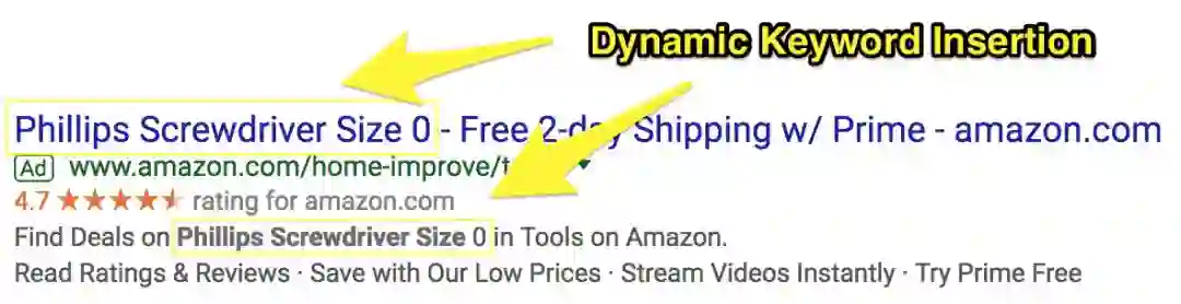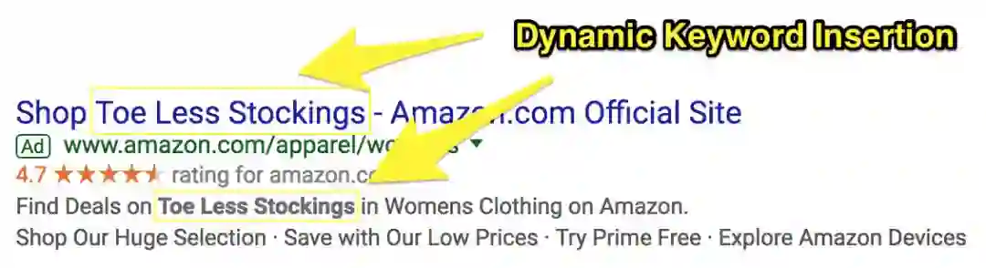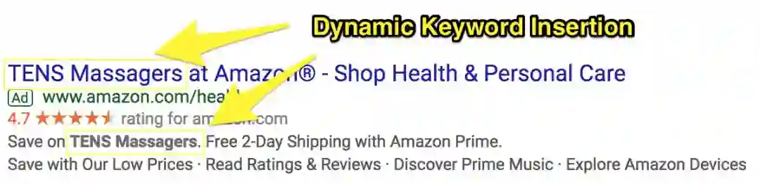 如此庞大规模的关键词广告对应巨大的工作量,为此亚马逊使用「动态关键词插入 (Dynamic Keyword Insertion,DKI)」技术,来使你正在搜索的关键词根据预置的广告模板,自动出现在广告的标题和描述里。