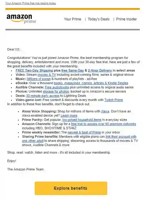 亚马逊通过会员欢迎邮件,确保免费试用的新用户知道所有潜在的好处:
