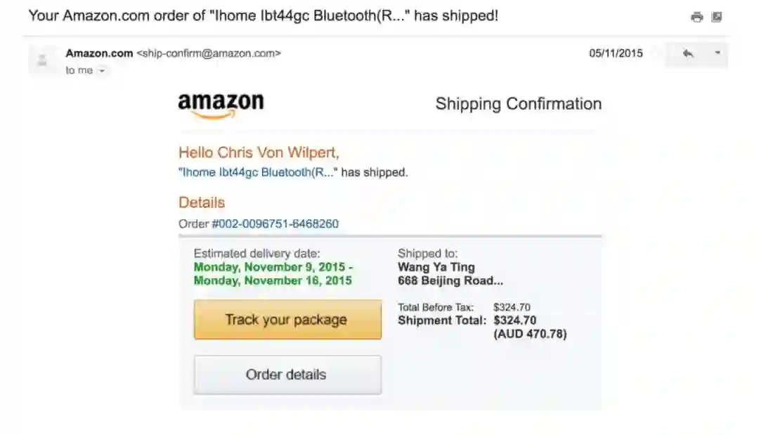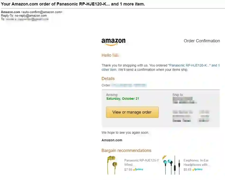 这封邮件的目的是:第一眼看过去,这封邮件的目标似乎是让用户确认购买信息。但是当你仔细看,你会发现这是一个伪装后的营销邮件,目的是通过「查看或管理订单」CTA 再次把用户带回到亚马逊的网站上。