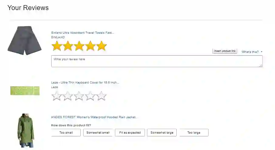 这封邮件的目标是:获得评论,你应该猜到了还有让购物者回到亚马逊的网站。如果我点击电子邮件中的一个星星,我就会被带到这个页面,在那里我可以写一段文本评论(并评论我其他购买的产品):