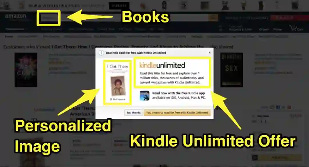 亚马逊通过在其「图书」页面上使用弹出窗口来促销 Kindle Unlimited。 当你使用 Kindle 查看图书时,你会立即看到一个弹出窗口。 亚马逊使用「可见性规则」,所以只有这本书能在 Kindle 上看的时候,才会在产品页面弹出窗口。