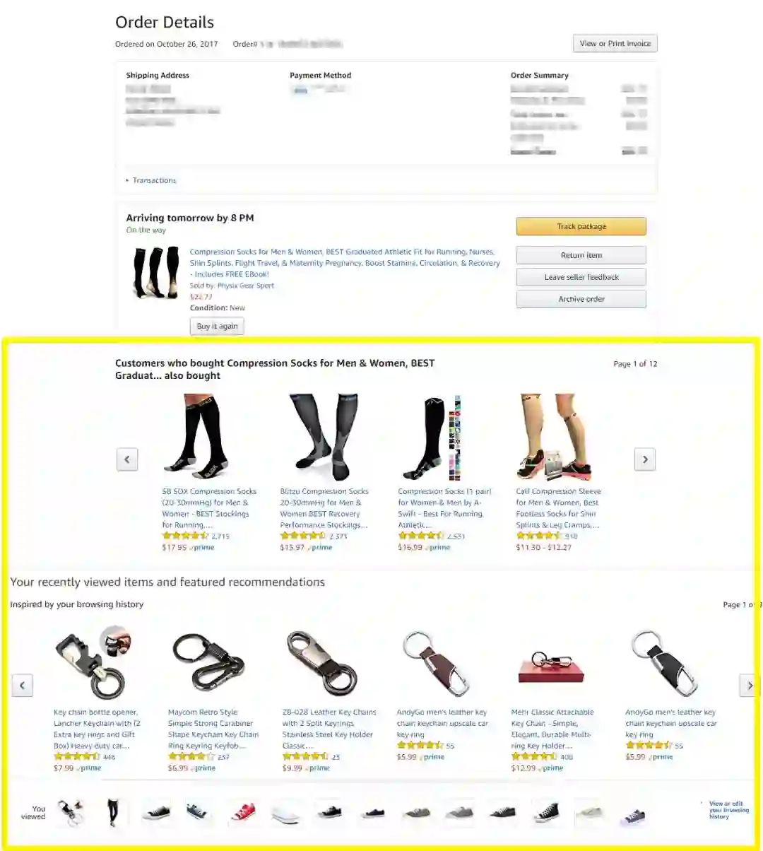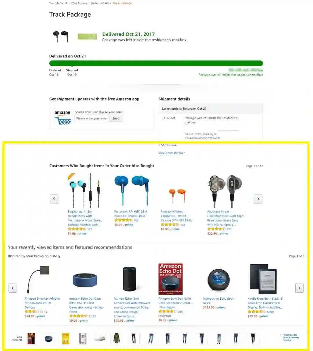 一旦你被带回到亚马逊的网站上查看你的「订单细节」,你就会被带到一个信息页面,页面头部是订单信息,尾部是两个亚马逊产品推广的模块: