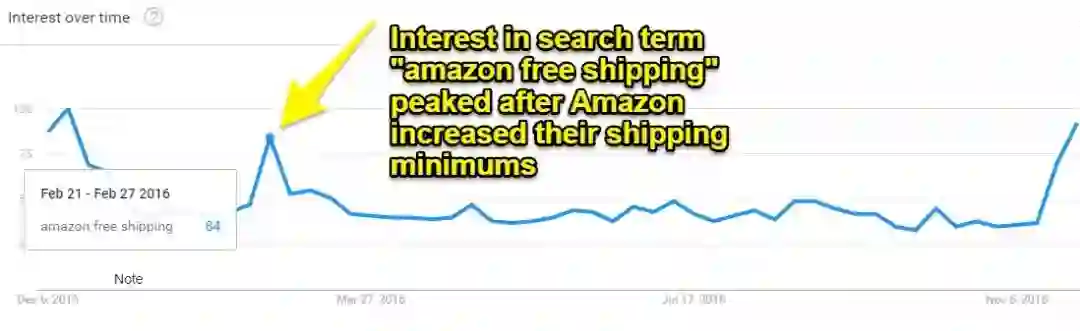正如你所看到的,在亚马逊宣布这一改变的那一周,人们对搜索词「亚马逊免费送货」的兴趣大增: