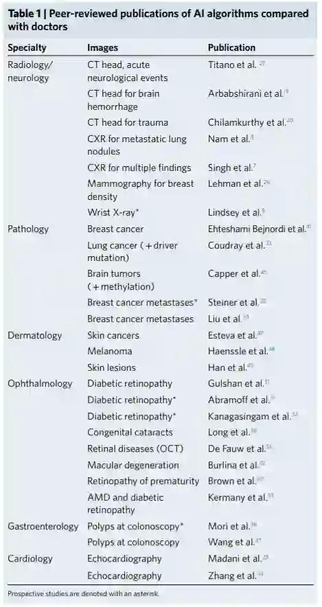 表 1:与医生比较的经过同行评议的 AI 算法论文