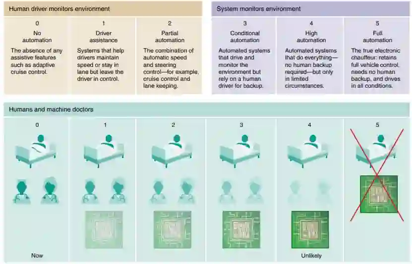 图 5:自动驾驶汽车与医学自动化的类比。第 5 级是不存在人类医生作为后备可能性的完全自动化,这不是目标。第 4 级是仅在非常有限的条件下使用人类备份,这也不是目标。目标是协同,将机器做得最好的功能与那些最适合临床医生的工作结合起来。