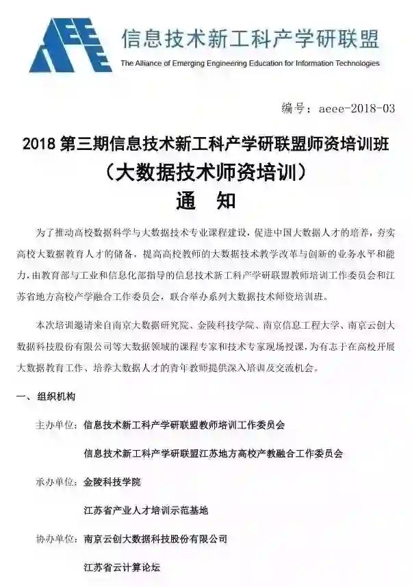 2018年5月25日-5月27日,2018第三期信息技术新工科产学研联盟师资培训班(大数据技术师资培训)将正式开班。此次培训由教育部与工业和信息化部指导的信息技术新工科产学研联盟教师培训工作委员会和江苏省地方高校产教融合工作委员会联合举办,为高校开展大数据教育工作、培养大数据人才的青年教师提供深入培训及交流机会。