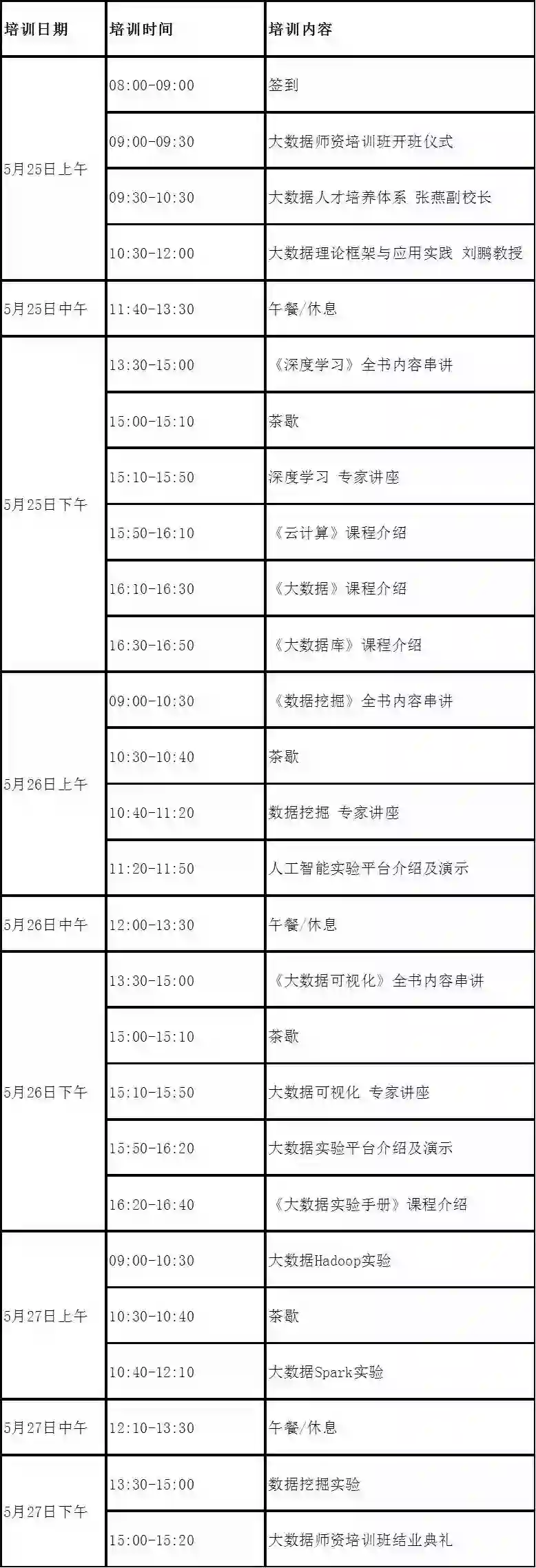 4.本次参加培训班的老师,将有机会免费获赠《深度学习》、《数据挖掘》和《大数据可视化》三本教材。