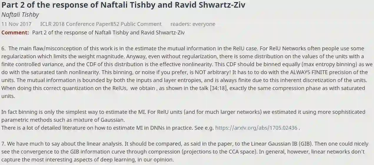 值得一提的是,在 Open Review 论文平台上,「信息瓶颈」理论的提出者 Naftali Tishby 等人也与论文作者展开了交锋。Tishby 表示,这篇新论文重复和验证了「信息瓶颈」理论先前研究的实验,证实并强化了这一理论,但同时又忽略了许多理论和实验结果,在许多方面都是有缺陷和误导性的。