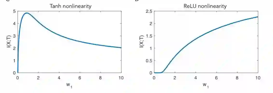 输入的互信息在所有的 ReLu 层中单调递增,没有明显的压缩阶段。因此,非线性函数的选择实质上影响了信息平面的动态。