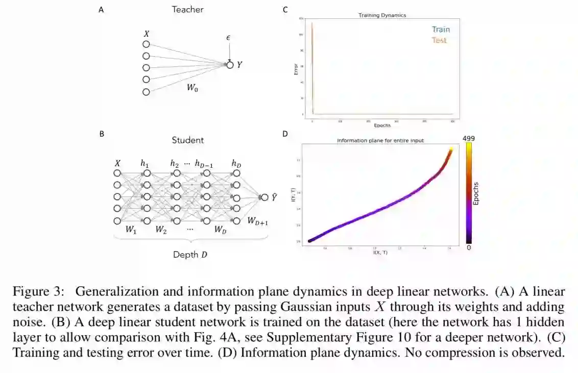 ……我们利用 student-teacher 设置(Seung et al.,1992;Advani & Saxe, 2017)下训练的简单线性网络探索泛化动态的最近结果。该设置可以让我们精确地计算网络泛化性能和表征的互信息(未经分箱),以及直接对比线性高斯问题已知的信息瓶颈边界。