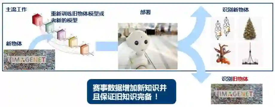 近年来,如ImageNet和COCO等大型数据集的新进展使得基于深度学习的计算机视觉技术显著提高。目前基于大量数据集的物体检测,分割和识别的计算机视觉应用也在智能家居、安防、工业检测等领域做出了突出的贡献。然而,机器人视觉对于视觉算法的开发和落地提出了新的挑战。计算机视觉算法隐含地对数据进行了独立同分布的假设,比如固定的类别,和单一简单的任务。很明显,真实环境的语义概念会随着时间的推移而动态变化。在实际应用的场景中,机器人需要长时间持续运行在可变的环境中,这就需要机器人拥有终身学习的能力去适应环境的改变。