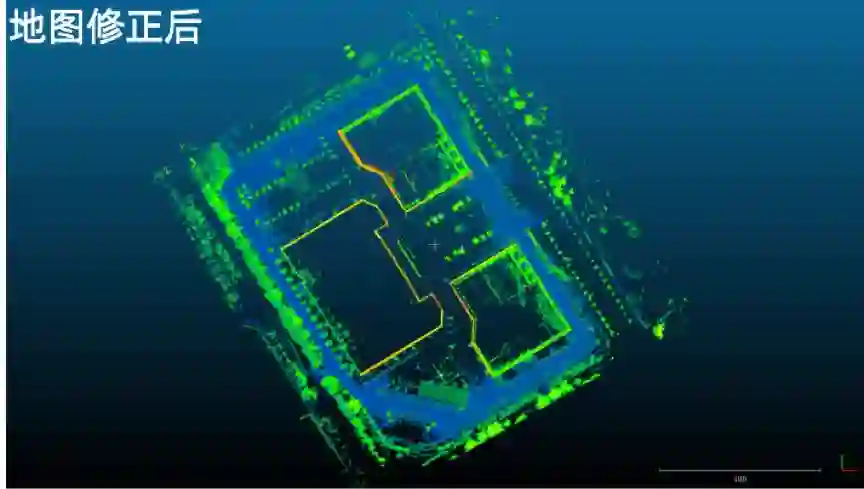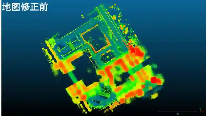 「多传感器融合建图软件」采用了激光雷达数据、GPS、IMU(惯性测量单元)以及里程计数据进行高精度的点云制作,关键技术是全局 SLAM 技术和动态物体剔除技术。根据现场的显示图可以看到,修正后的地图精度更高、噪声更小。