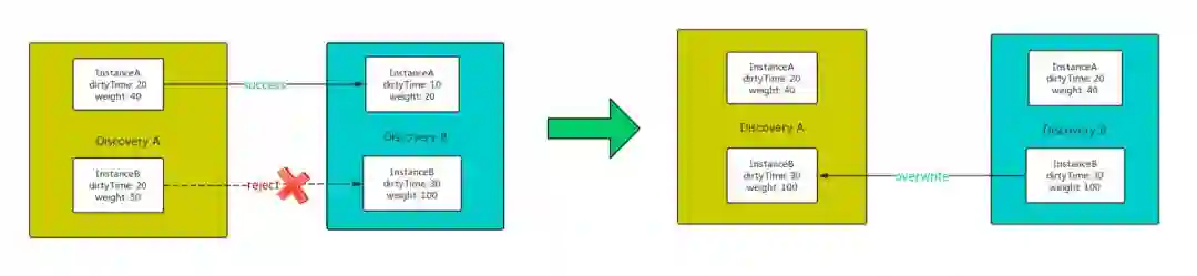 因为每一个服务实例都是全局唯一,因此可以通过服务的 ID 来全局定位这个实例,只需要保持一直递增的 Dirtytime,Discovery 每收到请求后都会在服务内广播一遍,广播时也可以检查数据的一致性,那这个服务方向就一定会保持一致。比如像上图所示,A向B传播的时候,表示B中的实例有部分存在或者是实例较小,此时A的信息同步过去然后把B给覆盖调。