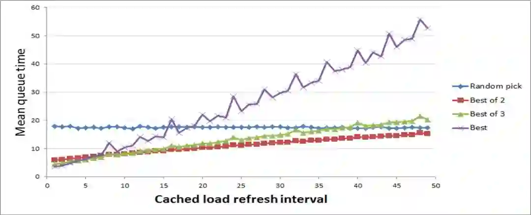 此外也可以引入一些随机量进来,依上图所示,横坐标为信息延迟时间,纵坐标为请求的平均响应时间。毫无疑问肯定是请求响应时间越小越好,横坐标的信息延迟也是越低越好。可以看到图中横坐标在接近0的时候,紫色线条的算法是永远在选节点里最快相应的请求,所以毫无疑问这时候是效果最好的,但是当横坐标在40-50区间的时候效果变得很差。