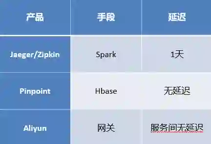 通过上图可以看出,Jaeger 和 Zipkin 是通过 Spark 做的,但是有一天的延迟;Pinpoint 本身是有自己的一套存储格式的,数据存在于Hbase,由于本身已经统计过了,所以完全没有可比性;阿里云主要是通过网关来实现,这个系统是针对网关统计的,因为请求和服务在部署时都会经过网关,通过服务与服务间的调用关系,因此服务间是无延迟的。