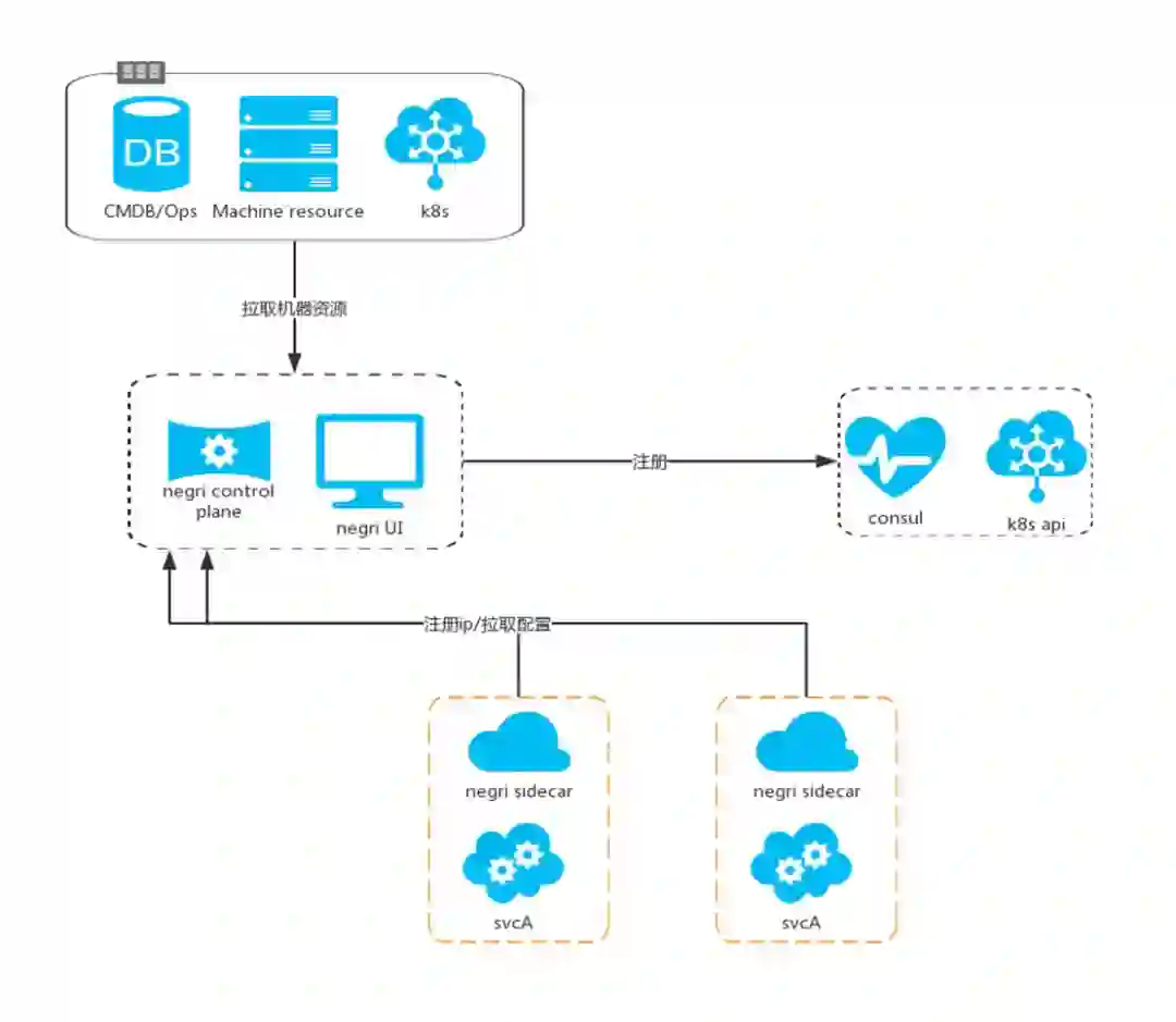 上图所示,这是 Negri 的整体框架图。Sidecar 被誉为构建下一代微服务的关键,对于构建高度高度可伸缩、有弹性、安全且可便于监控的微服务架构系统至关重要,因此 Negri 里对于如何部署配置 Sidecar 也十分的重视。