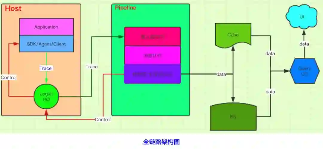 七牛全链路架构共分为三部分,从左至右依次为 HOST、服务端 Pipeline 以及数据可视化逻辑。先看下 HOST 部分,其中的 SDK 是指全链路中能够帮助用户接入的工具以及插件,下方的 Logkit 是通过链路实现的;