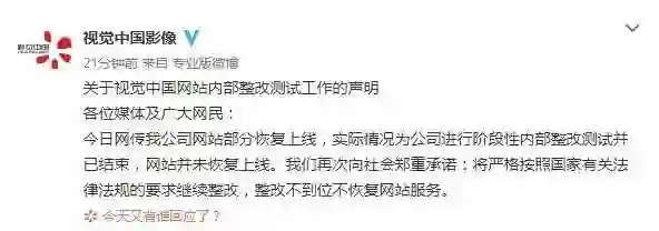 4月21日消息,有媒体报道视觉中国PC端网站已经小范围恢复上线。对此,视觉(中国)文化发展股份有限公司微信公众号发布声明,称实际为公司进行阶段性内部整改测试并已结束。网站并未恢复上线。