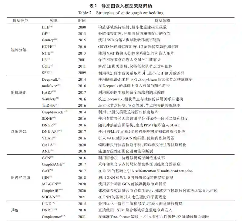 图分析用于深入挖掘图数据的内在特征,然而图作为非欧几里德数据,传统的数据分析方法普遍存在较高的计算量和空间开销。图嵌入是一种解决图分析问题的有效方法,其将原始图数据转换到低维空间并保留关键信息,从而提升节点分类、链接预测、节点聚类等下游任务的性能。与以往的研究不同,同时对静态图和动态图嵌入文献进行全面回顾,我们提出一种静态图嵌入和动态图嵌入通用分类方法, 即基于矩阵分解的图嵌入、基于随机游走的图嵌入、基于自编码器的图嵌入、基于图神经网络(GNN)的图嵌入和基于其他方法的图嵌入。其次,对静态图和动态图方法的理论相关性进行分析,对模型核心策略、下游任务和数据集进行全面总结。最后,提出了四个图嵌入的潜在研究方向。