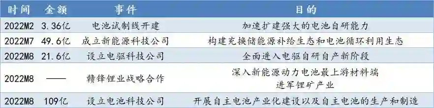 2022年2月开建了电池试制线;2022年7月构建电池循环生态;2022年8月宣布和头部的锂供应商赣锋锂业达成战略合作,打通上游原材料供应;随后斥资109亿成立了电池科技公司,目标是为了实现自主供应动力电池。
