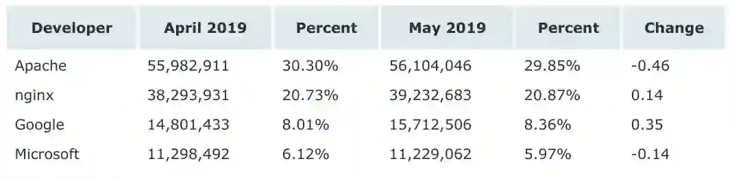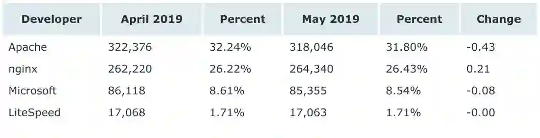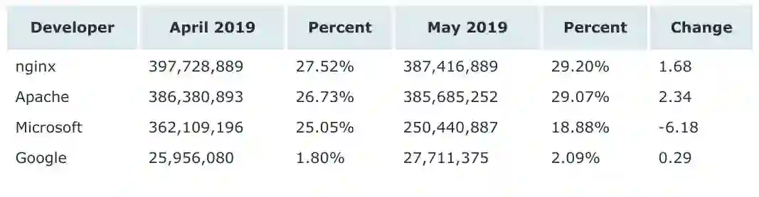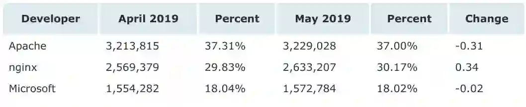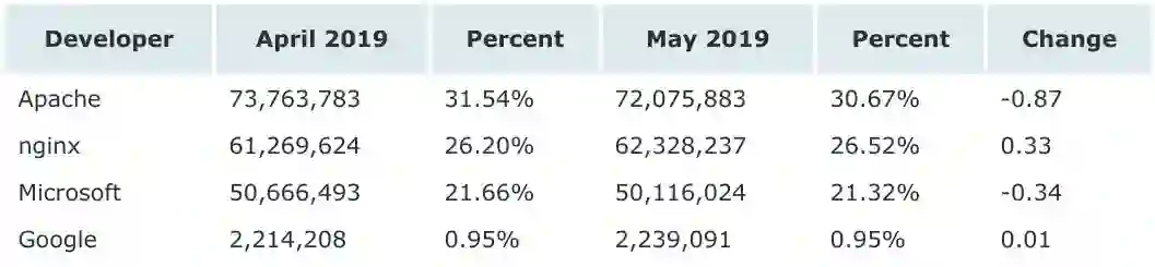 Netcraft 发布了 2019 年 5 月份全球 Web 服务器调查报告。Netcraft 公司官网每月公布的 Web Server Survey 是当今人们了解全球网站数量以及服务器市场分额情况的主要参考依据。