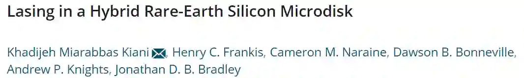 论文《Lasing in a Hybrid Rare-Earth Silicon Microdisk》已发表在《Laser & Photonics Reviews》上。值得一提的是,该论文的作者之一 Andrew Knights 是硅光子学领域的权威研究者。