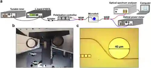 下图 a 为激光器测量设置原理图,下图b、c 显示了微盘谐振器的实验装置图像和显微图像。
