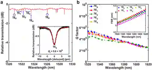该研究使用可调谐激光器和光纤探头对微盘谐振器的无源传输特性进行了表征。下图a 中显示观察到与微盘谐振器支持的五种不同 TE 模式相关的窄谐振。下图b 测量了各种谐振模式和相关自由光谱范围 (FSR) 的内部质量因子。