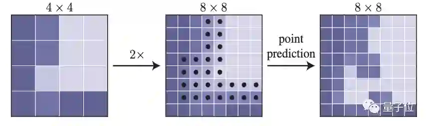 推理部分,如上文所说,是一个以从粗到细的方式迭代“渲染”输出mask的过程。在每次迭代中,PointRend使用双线性插值,对其先前预测的输出结果进行上采样。