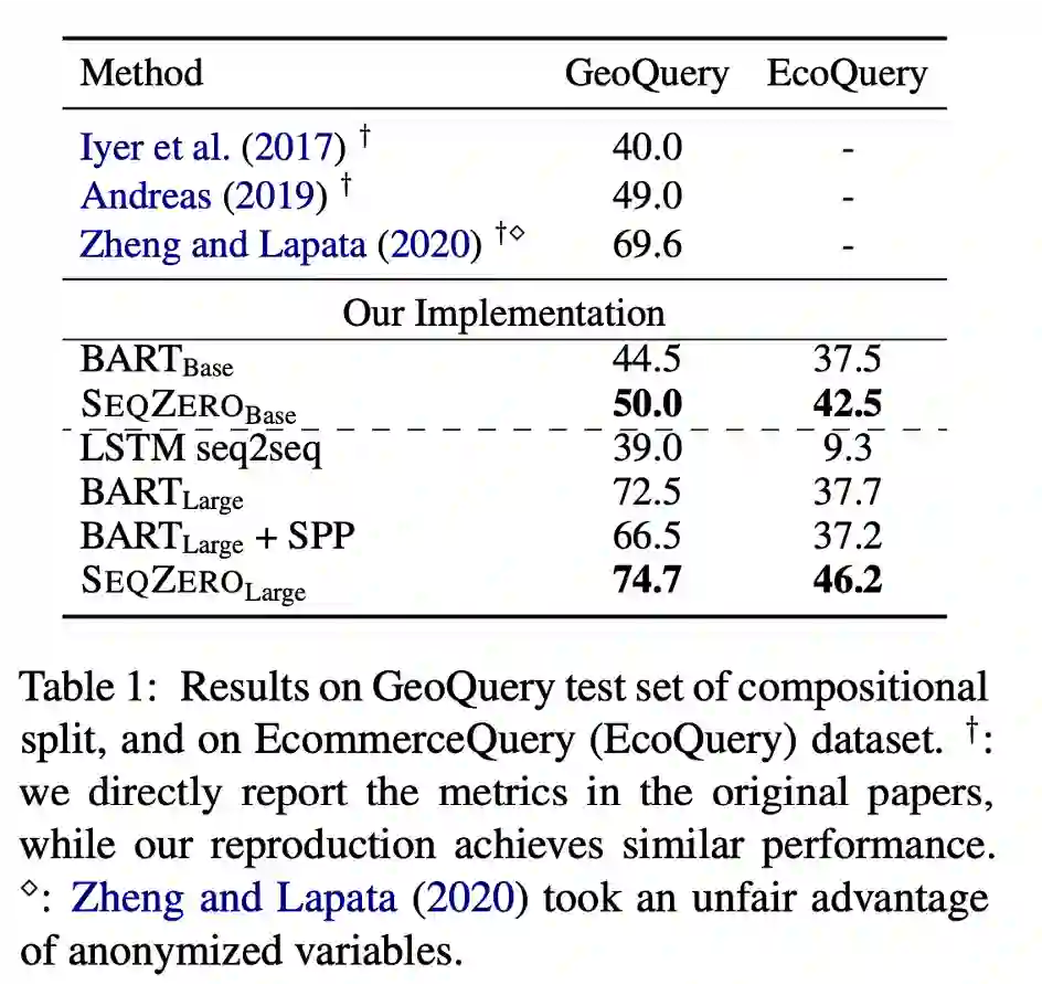 我们的方法在常用的组合泛化测试数据集GeoQuery和一个我们自建的EcommerceQuery数据集上都取得了明显的提升: