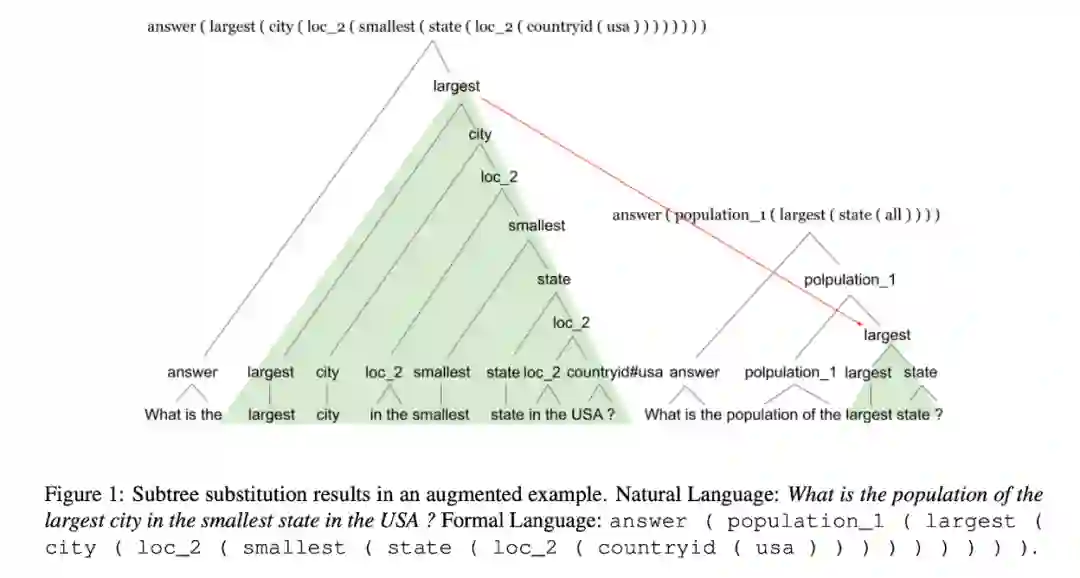 之前的基于规则的方法往往只能重组交换比较简单的结构,对于复杂的结构,由于自然语言和形式语言的对齐非常困难,重组交换得到的结果往往非常不准确。于是在我们的第二篇文章中,我们提出语义树子树替换的方法来进行组合性数据扩增 [9]。由于语义树子树已经实现了较好的自然语言到形式语言的对齐,我们的子树替换可以发现更复杂的可交换结构,并且较为准确地扩增出更复杂多样的数据。注意在文章中目标是把自然语言解析为另一种形式语言FunQL。