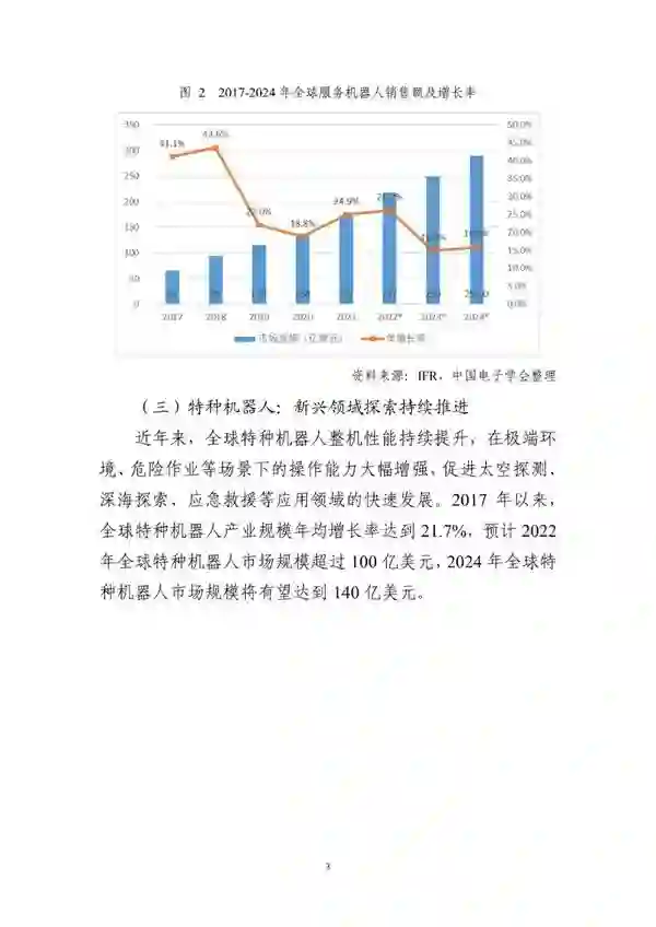 新一代信息技术、生物技术、新能源技术、新材料技术等与机器人技术加快融合。《报告》显示,机器人在汽车制造、电子制造、仓储运输、医疗康复、应急救援等领域的应用不断深入拓展。预计2022年,全球机器人市场规模将达到513亿美元,2017至2022年的年均增长率达到14%。其中,工业机器人市场规模将达到195亿美元,服务机器人达到217亿美元,特种机器人超过100亿美元。预计到2024年,全球机器人市场规模将有望突破650亿美元。