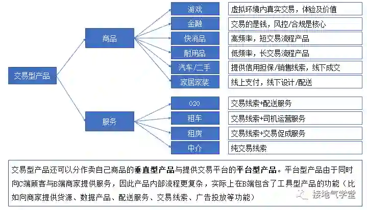 以交易的东西不同,还能细分为商品/服务两大类。由于特定的商品,其生产方式、交付方式有特点,因此还能根据商品特点,进一步细分出,诸如游戏、金融、消费品、耐用品等诸多各具特色的细类。