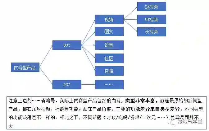 以内容形式不同,可以分为短、中、长视频,图文,语音。每一大类下,又有题材的区别,诸如:新闻、小说、娱乐、情感……以内容提供方不同,分为PGC(Professional GeneratedContent 专业内容生产者)/UGC(UserGenerated Content 普通用户内容生产者)。