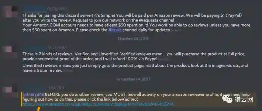 卖家通常会给每条评论支付4-5美元,再加上产品的退款。中间商会从中收取一定的费用,以我进入的Discord服务器为例,比例大概为20%-25%,但是评论者会免费得到商品。