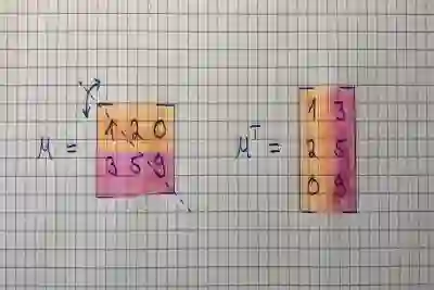 最后,我们将讨论矩阵转置。 这基本上是沿着45度轴线的矩阵的镜像。 获得矩阵的转置相当简单。 它的第一列仅仅是移调矩阵的第一行,第二列变成了矩阵移调的第二行。 一个m * n矩阵被简单地转换成一个n * m矩阵。 另外,A的Aij元素等于Aji(转置)元素。 下图说明:
