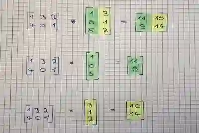 将第二个矩阵拆分为列向量,然后将第一个矩阵分别与这些向量中的每一个相乘。 然后你把结果放在一个新的矩阵中。 下面的图片逐步解释了这一点: