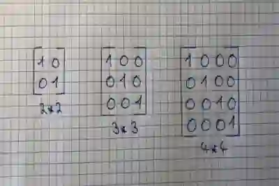 您可以通过以下事实来发现单位矩阵:它沿对角线为1,其他每个值都为零。它也是一个“方阵”,意思是它的行数与列数相同。