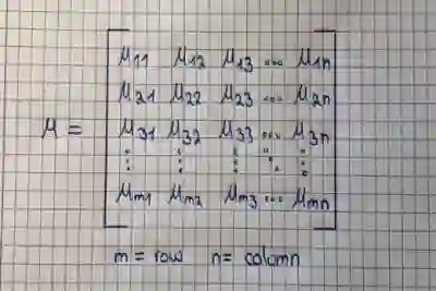 矩阵是一个有序的二维数组,它有两个索引。 第一个指向行,第二个指向列。 例如,M23表示第二行和第三列中的值,在上面的黄色图片中为“8”。 矩阵可以有多个行和列。 请注意,向量也是一个矩阵,但只有一行或一列。