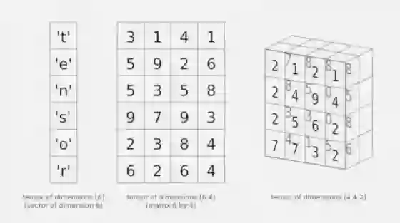 这是上述所有概念中最通用的术语,因为张量是一个多维数组,它可以是一个矢量和一个矩阵,它取决于它所具有的索引数量。 例如,一阶张量将是一个向量(1个索引)。 二阶张量是矩阵(2个指数)和三阶张量(3个指数),更高的称为高阶张量(超过3个指数)。