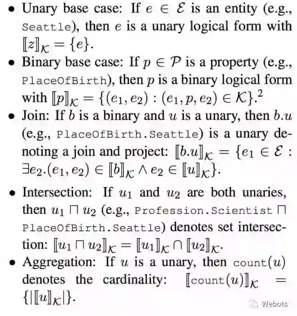 我们用表示一个逻辑形式,用表示知识库,表示实体,表示实体关系(有的也称谓语或属性)。简单而言,逻辑形式分为一元形式(unary)和二元形式(binary)。对于一个一元实体,我们可以查询出对应知识库中的实体,给定一个二元实体关系,可以查到它在知识库中所有与该实体关系相关的三元组中的实体对。并且,我们可以像数据库语言一样,进行连接 Join,求交集 Intersection 和聚合 Aggregate(如计数,求最大值等等)操作。具体来说,逻辑形式有以下形式和操作: