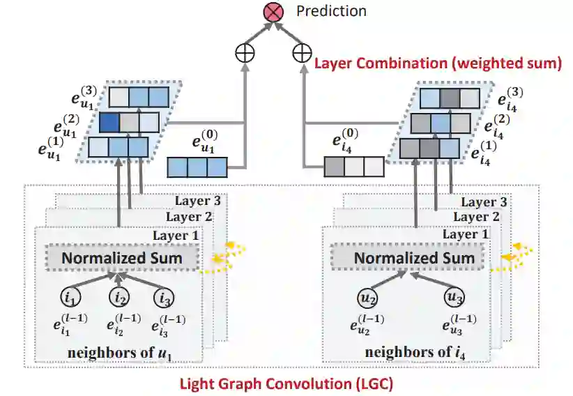 。他们提出了一个新模型 LightGCN,其中仅使用 GCN 中的最基本组件邻域聚合(neighborhood aggregation)来进行协同过滤。具体来说,LightGCN 通过在用户 - 物品(user-item)交互图上线性地传播用户和物品嵌入,进而学习它们,并将所有层上学得的嵌入加权和用作最终嵌入(final embedding)。